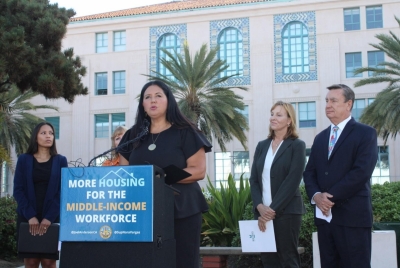Photo: in anticipation of Tuesday’s vote, Supervisor Anderson (left, at podium) and Vice Chair Vargas (right) hosted a press conference along with Deborah Norwood Ruane (center-right), founder of the Middlemarch Fund, Lori Holt Pfeiler (center), CEO of Building Industry Association, and Angeli Calinog Hoyos (center-left), Public Affairs Manager at the San Diego Regional Chamber of Commerce.