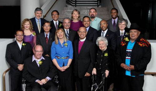 Union Bank and KPBS honored the 2012 Local Heroes at the San Diego Natural History Museum: Back row (L to R) honorees Michael A.V. Cruz, Larry T. Baza, Jill Borg Spitzer, Danny Gutierrez and JiAel Brownell; middle row (L to R) honorees Michelle Houle and Mike Kawamura; Tom Karlo, KPBS general manager; George Ramirez, Union Bank executive vice president and chief diversity executive; Lawrence Henry, Union Bank senior vice president and regional executive; and honoree Jeri Dilno; front row (L to R) honorees Dennis-Michael Broussard, Louis Frick, Laurel Moorhead, Bishop Roy Dixon, Dr. Doris A. Howell and Leroy Elliott. (Honorees Patricia A. Dixon and Gussie Zaks not pictured.)