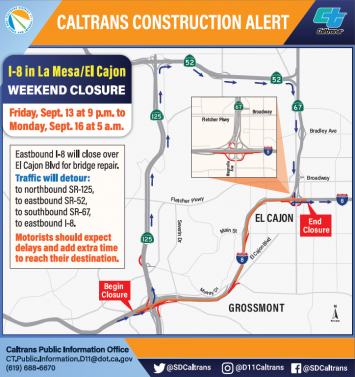 July 29, 2016 (San Diego) - Caltrans announced that the connector ramps from westbound Interstate 8 (I-8) to northbound and southbound State Route 125 (SR-125) will be closed for bridge work Saturday from 9 p.m. until Sunday at 9 a.m. on four consecutive weekends beginning July 30.