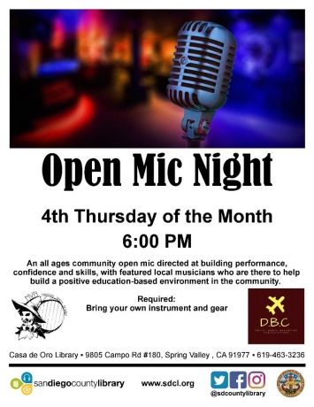 September 24, 2012 (La Mesa) – Space Bar Internet Café hosts an Open Mic night on the fourth Thursday each month from 7:30-10 p.m. at 7454 University Avenue, La Mesa.