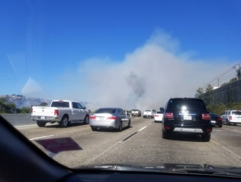 ECM reporter Rebecca Jefferis-Williamson was driving toward the fire on I-8 and got cell phone photos (top left and lower left) of flames beside the freeway and a wall of smoke confronting motorists. "The other driver and I didn't know what we were driving into, but we were not stopped from advancing," she reports, adding that orange and black embers and ashes were hitting her car. One ember came through her open window and burned her finger, she added.