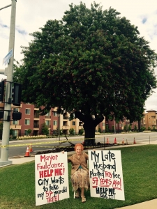 May 9, 2016 (Allied Gardens) – Marie Ostwald, 91, issued a Mother’s Day plea on Facebook asking San Diego Mayor Kevin Faulconer to stop city workers from cutting down a tree that her husband planted back in 1957. She included a photo of herself beneath the tree’s expansive shade and invited other mothers to come sit with her today, Monday, to help save her beloved tree.