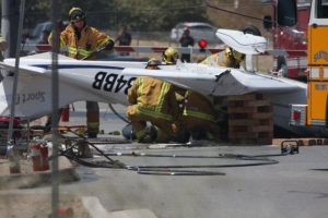 The plane had taken off from Gillespie Field when the pilot experience mechanical problems and turned back. The plane clipped trolley lines, crashing upside down onto a roadway.  Rescue workers had to wait for trolley lines to be deenergized before rescuing the pilot and sole occupant, who complained of numbness in his arm and was transported to a local hospital for treatment.