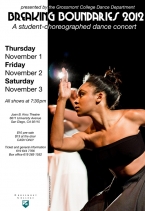 October 31, 2012 (San Diego) – Grossmont College dance students present ‘Breaking Boundaries’, November 1 -3 at 7:30 p.m. at the Joan B. Kroc Theatre, 6611 University Ave., San Diego. The concert is an annual student choreographed event that will showcase a variety of dance genres, including modern dance, ballet, jazz and hip-hop.