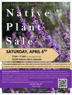 February 24, 2019 (Lakeside) – The Lakeside River Park Conservancy will hold a native plant sale on Saturday, April 6 from 9 a.m. to 2 p.m. (or until supply runs out) at 12108 Industry Road in Lakeside.
