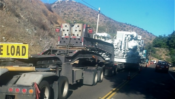 August 8, 2013 (San Diego’s East County)—A truck carrying an over-sized load has repeatedly become stuck on curves along Highway 94 between Dulzura and Tecata, causing a SIG ALERT that extended more than 20 hours. Residents reported seeing the slow-moving rig the past two nights, however, and Deerhorn Valley Antler Kim Hamilton reports the ordeal has been ongoing for 54 hours as of late tonight, forcing residents to take a detour of 70 to 80 minutes. As of 9:30 p.m. the highway remained shut down in both directions.