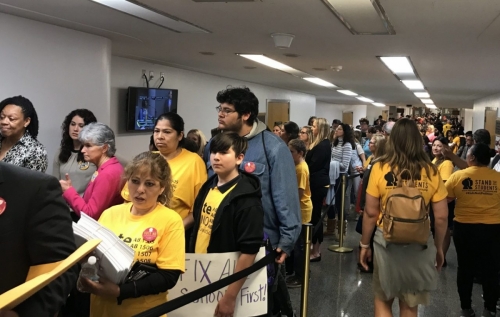 Photo: Charter school advocates and teachers unions mass at the Capitol on April 10, 2019, as state lawmakers consider dramatic curbs on charter schools. Photo for CALmatters by Dan Morain