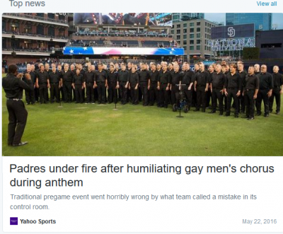 May 22, 2016 (San Diego)—When 100 volunteer members of the San Diego Gay Men’s Chorus took to the field Saturday night to sing the national anthem at the San Diego Padres vs. Dodgers game, their microphones were inexplicably off . A recording of a woman singing the Star Spangled Banner was played over the loudspeakers instead of the men's voices.