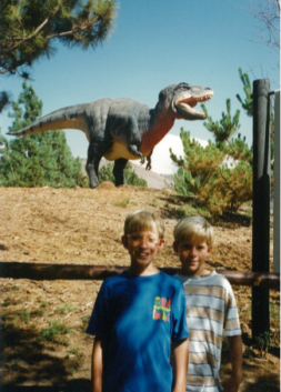 Three decades ago, his young sons had a fascination with dinosaurs, including their favorite toy, a three-foot-tall dinosaur which they named “Toby The T-Rex,” Phair explained. (Photo, right: the Phair sons at the San Diego Wild Animal Park 30 years ago.)