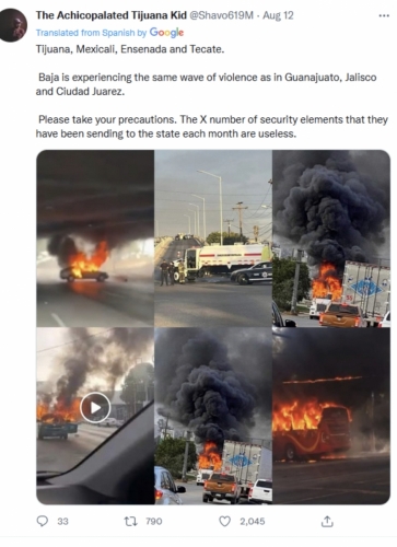 August 13, 2022 (San Diego) – Tijuana is on lockdown tonight amid a wave of violence, arson fires and attacks on bystanders fueled by warring drug cartels. American citizens are urged to avoid the areas and if already there, to seek secure shelter immediately.