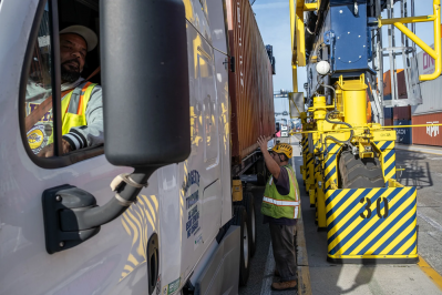 Photo, right: a hydrogen-powered, rubber-tired gantry crane loads a shipping container onto a semi-truck at Yusen Terminals at the Port of Los Angeles in San Pedro on Feb. 11, 2025. Photo by Joel Angel Juarez for CalMatters