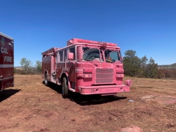 The fire retardant released from a plane splattered explosively onto his crew’s fire engine, turning the vehicle pink.