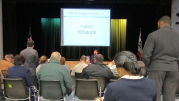 Assemblymember Block discussed the basic tenets of the proposed budget. Next, Corinne Wilson, lead research and policy analyst from the nonprofit Center for Policy Initiatives, gave a Powerpoint presentation covering state, federal and local revenue and expenditures as well as the budget's impact upon the state.