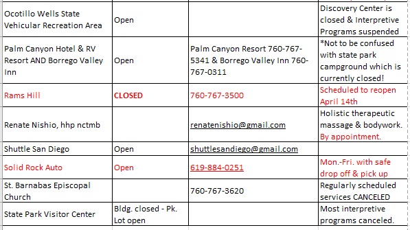 March 28, 2020 (Borrego Springs) – The Borrego Springs Chamber of Commerce has sent an e-mail with information for Borrego-area residents on what’s open and closed.