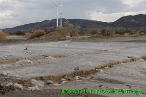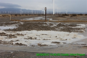 One troubling possibility is that the substance found this week could be run-off of herbicides sprayed shortly before the storm. The herbicide was approved by the Bureau of Land Management to suppress non-native mustard weeds brought in by vehicles at Pattern Energy’s wind project. Spraying of the neurotoxic herbicide was done over the objections of Ocotillo residents. Is that herbicide now polluting public waterways?