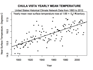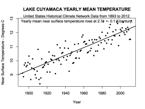 Chula Vista temperatures are rising at 3 degrees F every century. Lake Cuyamaca temperatures are jumping up nearly 5 degrees F per century. This is 2.5 and 4 times the global average, respectively!