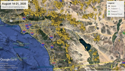 While thousands of lightning strikes across northern and central California have caused major wildfires, Southern California has also had numerous lightning strikes, as the Earth Network image sent by the National Weather Service shows for Friday, Aug. 21: