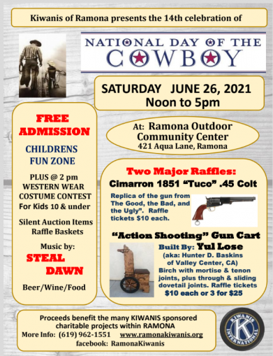By Miriam RafteryMay 28, 2021 (Ramona) – Kiwanis of Ramona will present the 14th celebration of National Cowboy Day on Saturday, June 26 from 12 noon to 5 p.m. at the Ramona Outdoor Center, 421 Aqua Lane in Ramona.